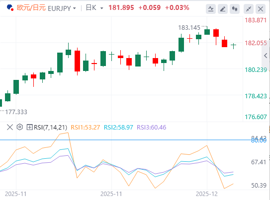 12月17日,欧元/日元在连续两天下跌后坚守,周三欧市初盘181.90。随着日本公布11月调整后商品贸易余额629亿日元,低于10月的740亿日元,日元面临下行压力,汇率交叉可能会升值。