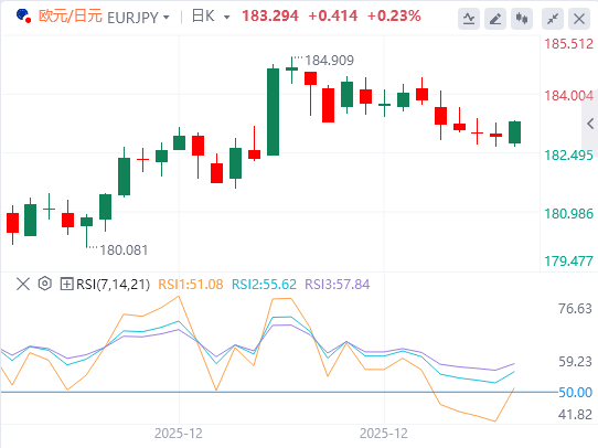 1月9日,欧元/日元已收复上一交易日的近期跌幅,周五亚洲时段交易约183.20。日线图的技术分析显示,14天相对强弱指数(RSI)位于54(中性)处,显示出从超买回落后保持稳定动能。RSI略升至中50多,支持稳定,但未显示出走宽的信号。
