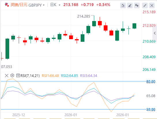 1月22日,周四欧洲交易日开始时,英镑/日元上涨0.22%,接近213.10点。随着日元(JPY)在日本央行周四公布货币政策前整体表现不佳,货币对上涨。