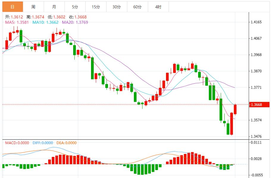 周一,美元/加元徘徊于1.3672下方,现交投于1.3670附近,涨幅0.40%。