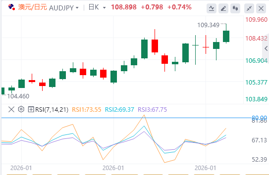2月3日,周二欧市初盘,澳元/日元交叉点升至约108.85。澳元兑日元(JPY)在澳大利亚储备银行(RBA)利率决定后走强。交易员们将关注周二格林威治标准时间4:30的澳储银行新闻发布会,以获取更多关于利率前景的线索。