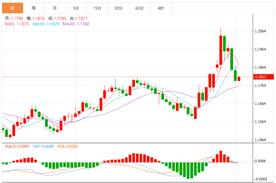 周二,欧元/美元徘徊于1.1812下方,现交投于1.1811附近,涨幅0.17%。