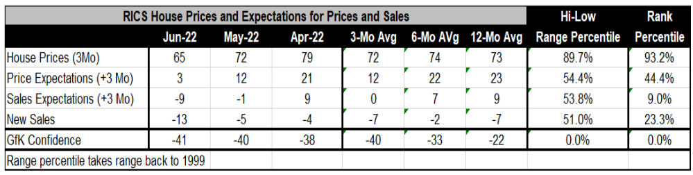 经济处于压力之下,并且有一些衰退的预期。GfK对英国的消费者信心评级从5月份的-40下滑至6月份的-41。四月份的读数为-38。12个月的平均值为-22。显然,这个系列在最近几个月一直在大幅下滑。6月,它已跌至1999年以来的历史最低点。