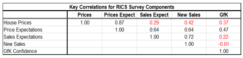 下表显示了这些变量之间的相关性。例如,价格预期和销售预期具有0.64的相关性。当价格预计上涨时,通常预计销售额也会上涨。价格也是如此:运动的价格预计会保持运动——这是一个牛顿过程。价格与预期价格的相关性是相当大的0.87。新销售和价格预期的相关性为0.64。销售预期和实际新销售的相关系数为0.72,再次证明了房地产动能的影响。当房屋销售强劲时,通常预计它们在未来将保持强劲。价格预期与消费者信心的相关性为0.47,接近0.5。