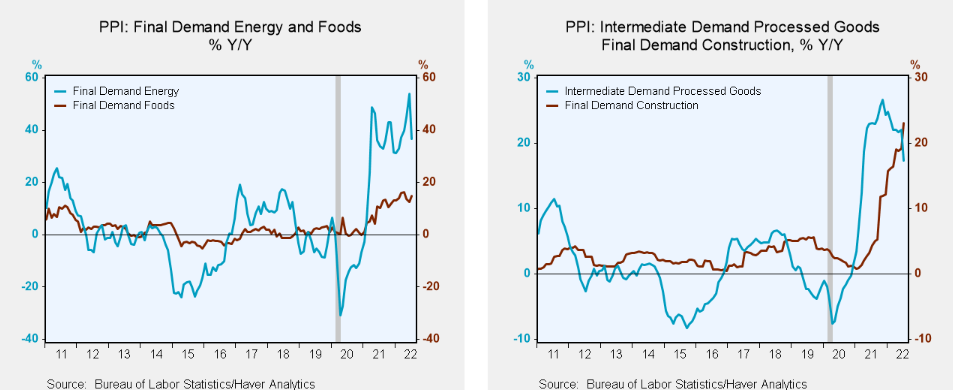 扣除食品和能源的商品PPI在6月上涨0.4%后,7月上涨0.2%(同比增长8.5%)。成品消费品价格扣除食品和能源价格后,连续第二个月上涨0.6%(同比增长8.4%)。耐用消费品价格上涨0.5%(同比增长8.1%),核心非耐用消费品价格上涨0.7%(同比增长8.5%)。私人资本设备价格在6月份上涨0.8%之后,也上涨了0.5%(同比增长9.1%)。