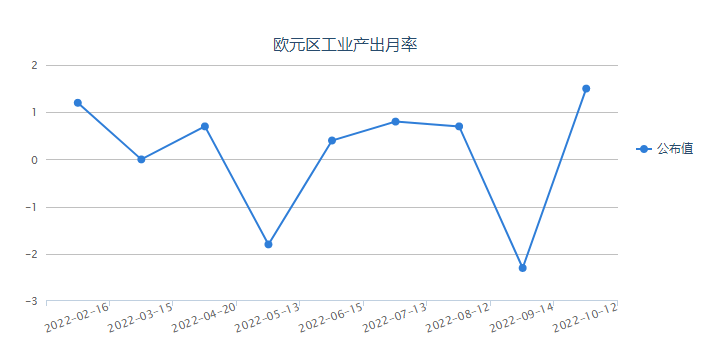 周一18:00,欧元区公布最新数据,欧元区9月工业产出月率10月是1.50%,今日公布值将于18点发布,预期为0.3%。
