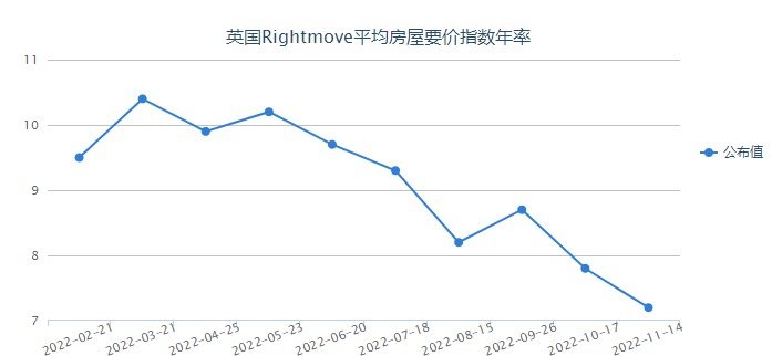 周一8:00,英国公布最新数据,英国11月Rightmove平均房屋要价指数年率10月是7.80%,今日公布值已于8点发布,公布值为7.2%。