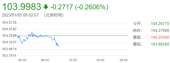 截至目前,美元指数窄幅震荡,目前交投于104.22附近。美元指数周三收盘下跌0.4%,收报104.26,回吐了周二的部分涨幅,周二美元指数曾达到104.86的两周高点。仍然稳固的就业市场被认为给了美联储抗通胀战役中继续加息的空间。周五将公布的12月就业报告是本周美国经济的主要焦点,预计将显示雇主在该月增加了20万个工作岗位,而12月的平均时薪预计将增长0.4%,同比增幅为5%。