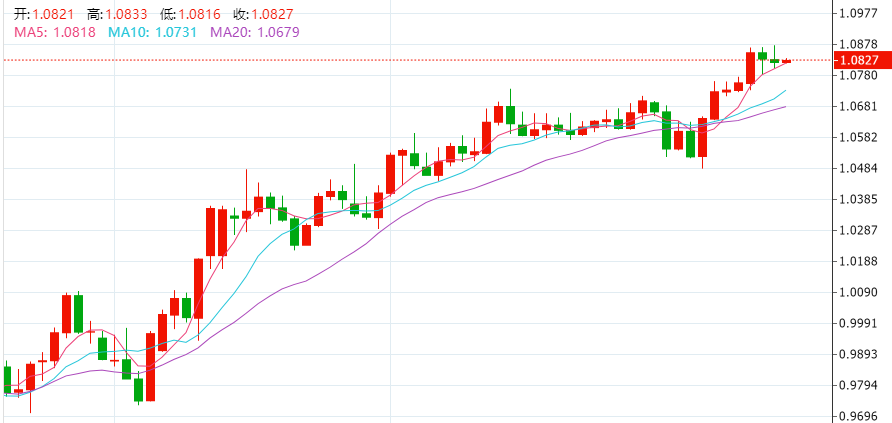 截至目前,欧元兑美元收报1.0827美元。欧元兑美元周一稍早创下1.0874美元的九个月新高,随后回落,收盘报1.0820美元,跌幅约0.11%。