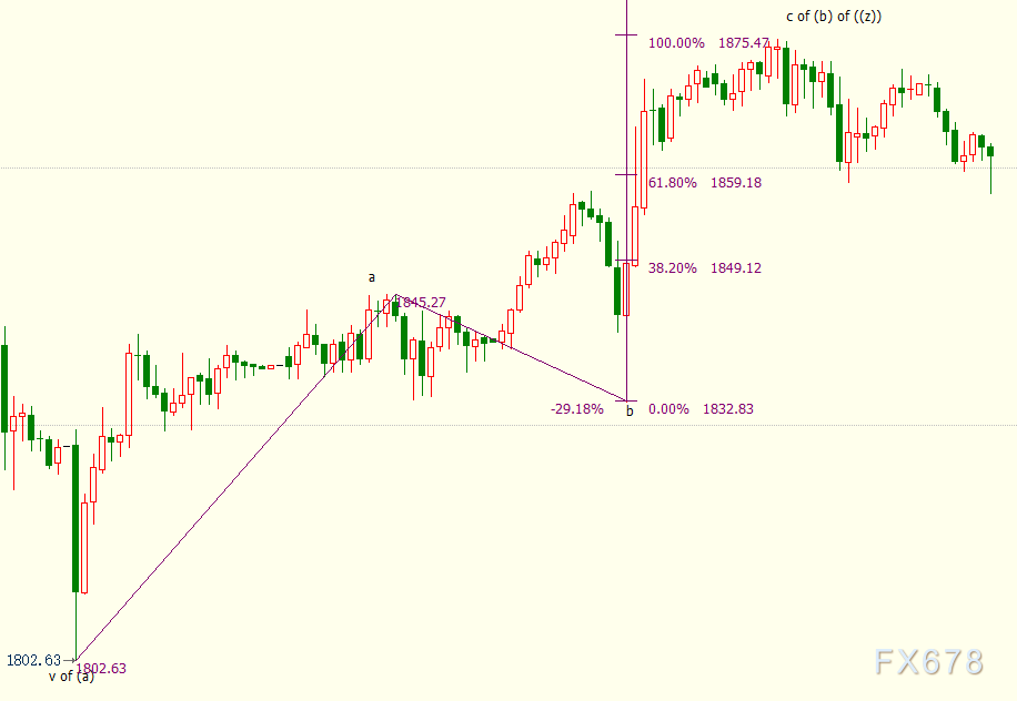 小时图上看,金价在1875美元遇阻,它是自1833美元开启的上行c浪的子浪。c浪隶属于自1802美元开启的反弹(b)浪。金价可能已开启下行(c)浪走势。(b)浪和(c)浪是自1959美元开启的下行((z))浪的子浪。