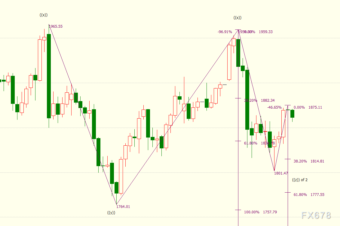 ((z))浪则隶属于自2075美元开启的调整2浪,((z))浪的61.8%目标位在1778美元。日线图上看,2浪呈现三重三锯齿形结构,可细分为((w))((x))((y))((x))((z))五子浪。((z))浪的100%目标位在1758美元附近。