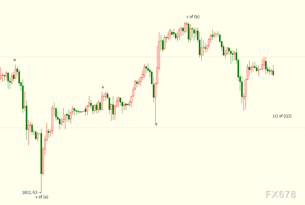 小时图上看,金价在1875美元开启下行(c)浪走势,下方支撑看向38.2%目标位1815美元。(c)浪是自1959美元开启的下行((z))浪的子浪,((z))浪的61.8%目标位在1778美元。