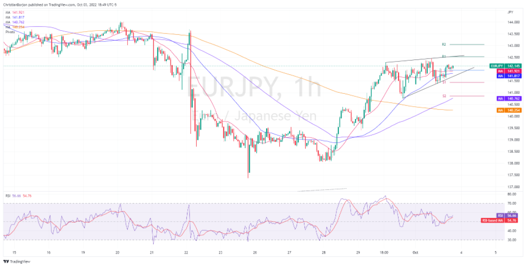 欧元/日元上涨接近20日均线,涨幅只有0.02%,原因是美国经济数据的发布表明经济活动放缓,投资者预期美联储将不再那麽激进,加大市场对风险资产的偏好。此外,英国财政大臣夸西?库尔滕(Kwasi Kuarteng)放弃减税预算,因为这一计划引发了市场动盪。发稿时,欧元/日元交投于142.14附近。