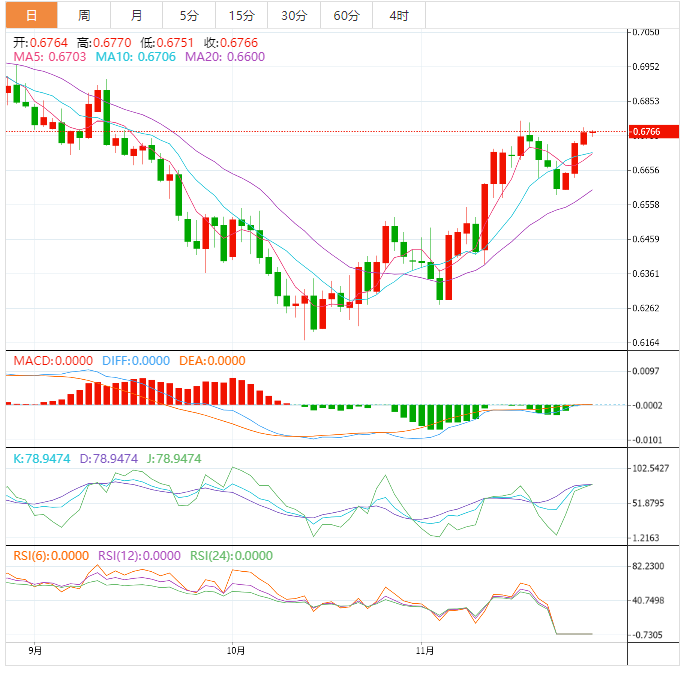 澳元延续了连续三天的涨势,并在周四收复了0.6700,这是由于美联储11月的会议记录,美元(USD)对大多数八国货币大幅贬值。由于美国感恩节的庆祝活动,澳元兑美元在周五交易清淡的交易日中触及日低点0.6726后,目前交易于0.6764。