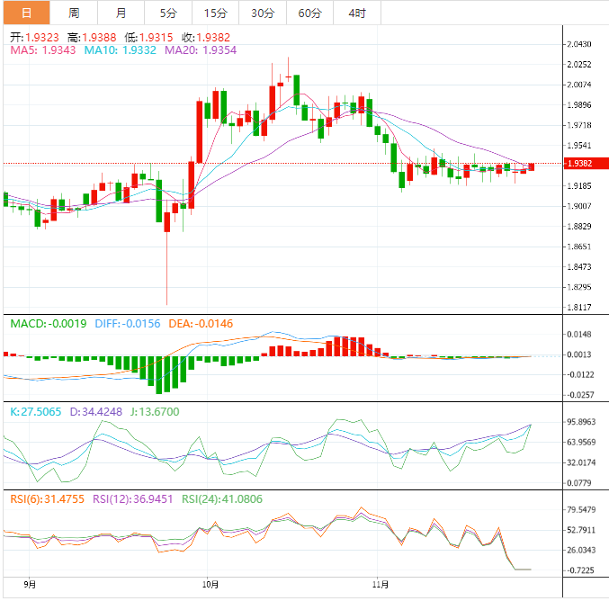 若突破1.9350附近的三角顶,可能引发与三角顶相同大小或约400点的反弹。类似地,跌破支撑位1.9300之后可能会出现同样高度的抛售。