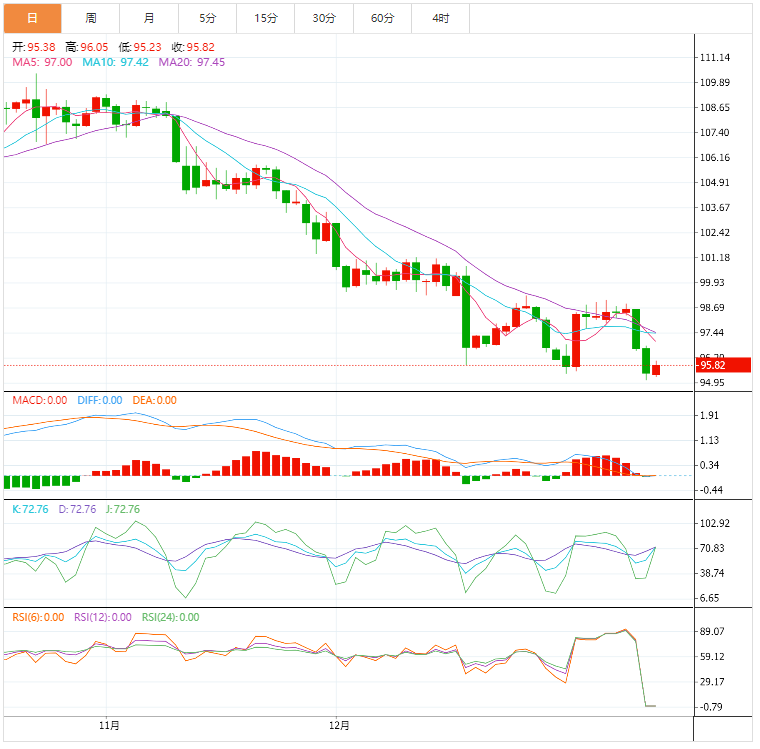 斐波那契回撤工具显示38.2%的水平与通道中部96.50一致,而61.8%的斐波那契位于移动均线的动态阻力位附近。