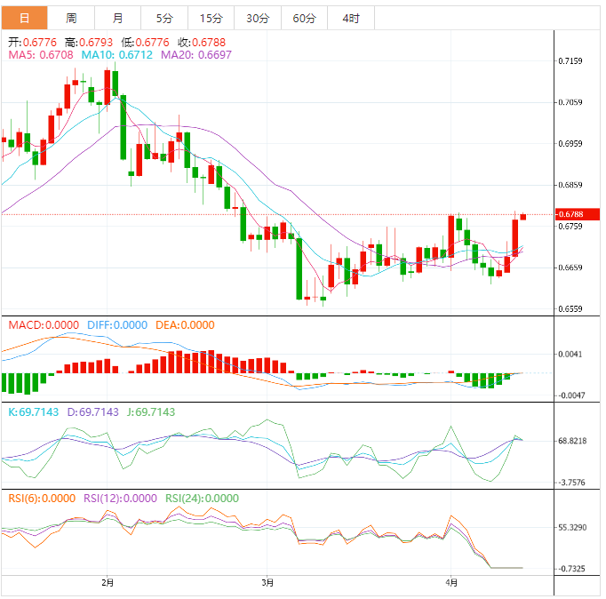 澳元兑美元在七周高点附近不断走高,在亚洲市场周五早盘突破0.6800后,又转至0.6780。这样做,澳元对欢呼乐观的澳大利亚通胀数据,以及悲观的美国通胀数据和美联储(Fed)的担忧。
