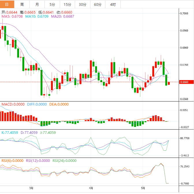然而,该货币对在4月28日至5月10日上涨期间的61.8%斐波那契回撤位(接近0.6670)在5月10日的下行阻力线(最晚接近0.6680)之前,限制了澳元兑美元的短期反弹。
