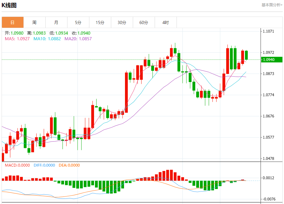周三盘中,欧元/美元报1.0940,跌幅0.37%。