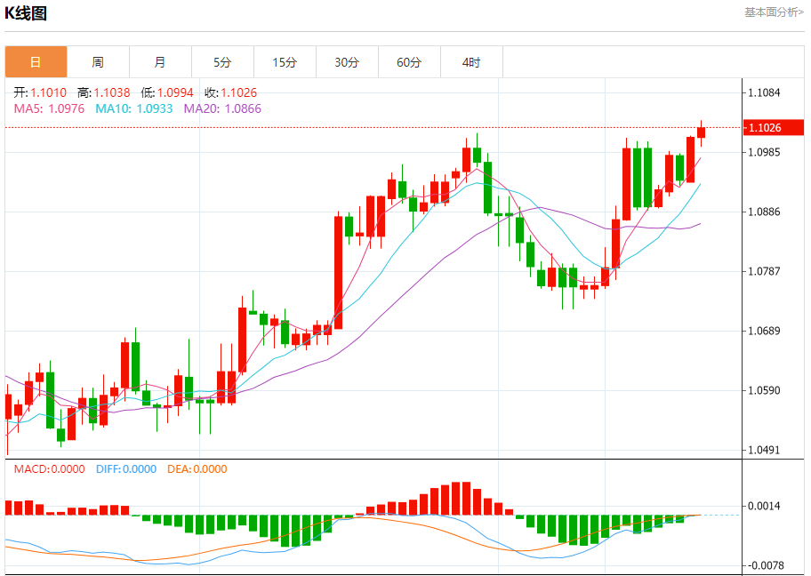 周五盘中,欧元/美元报1.1027,涨幅0.14%。