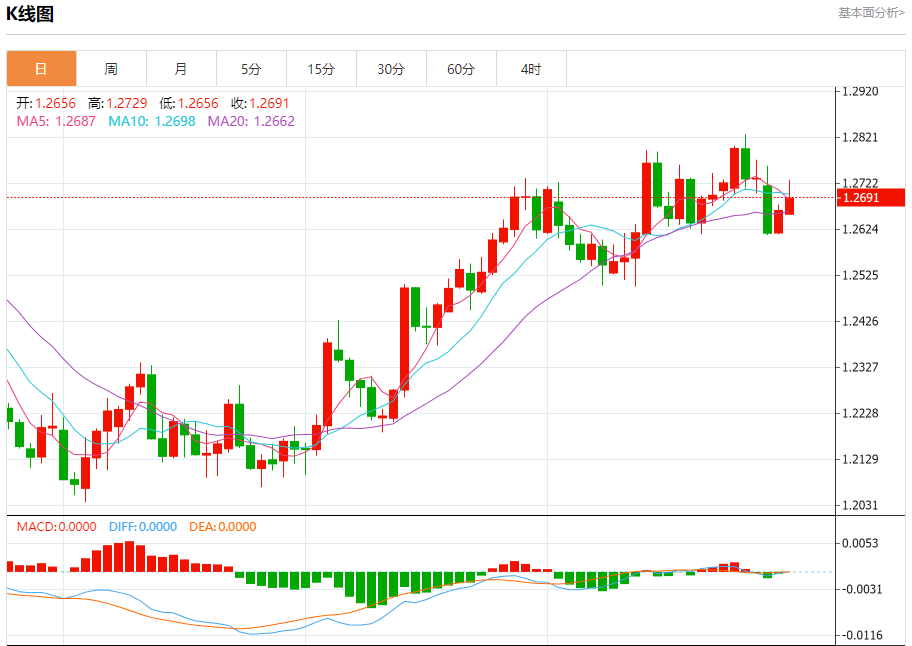 周四盘中,英镑/美元报1.2693,涨幅0.22%。