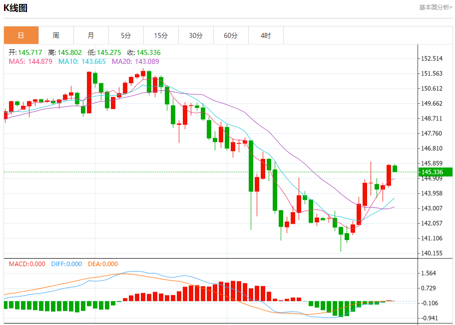 周四盘中,美元/日元报145.350,跌幅0.28%。