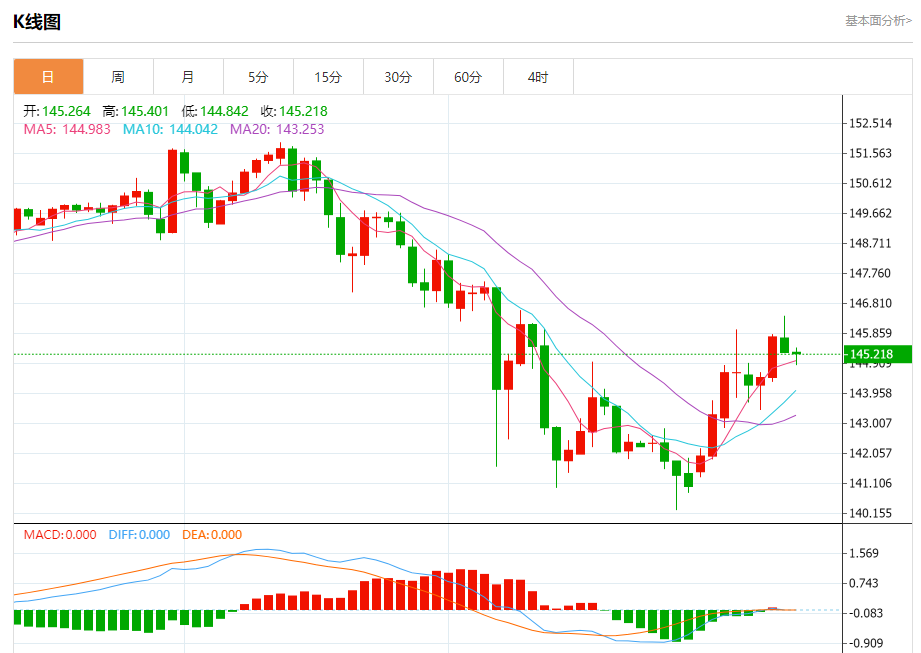 周五盘中,美元/日元报145.232,跌幅0.03%。