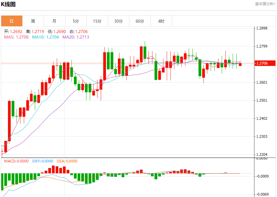 周一盘中,英镑/美元报1.2707,涨幅0.03%。
