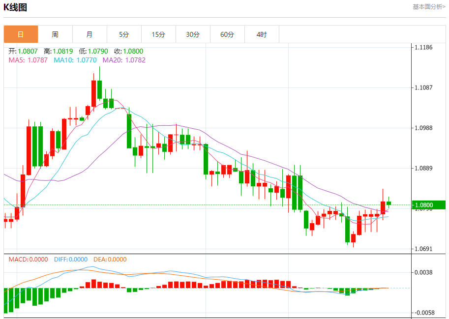 周三盘中,欧元/美元报1.0801,跌幅0.07%。