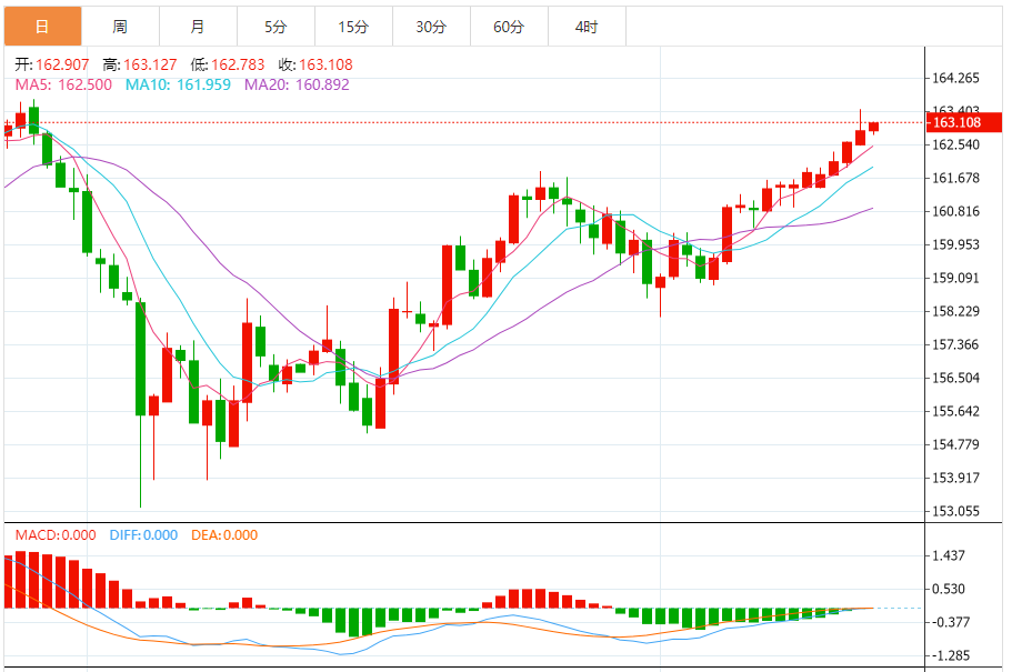 周五,欧元/日元上涨0.12%至163.124附近。