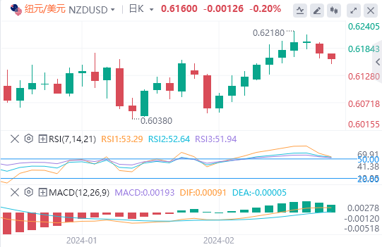 2月27日,周二欧市盘前,纽元/美元在周二连续第二日下跌,跌至一周低点0.6100附近。不过,在美元(USD)小幅回落之后,现货价格从日线低点回升了几个点,目前交投于0.6160附近,全天跌幅0.20%。