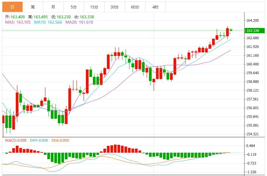 技术上,欧元兑日元昨日反弹至163.20关口上方,提供了积极的信号,录得163.71点的额外涨幅,随后朝着突破的关口攀升,形成横向波动。