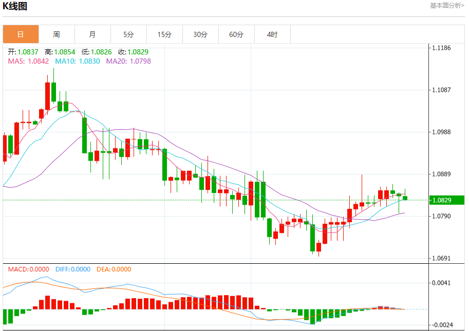 周四盘中,欧元/美元报1.0830,跌幅0.08%。