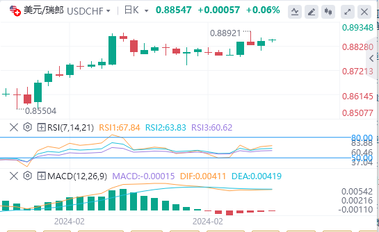 3月5日,周二亚市盘中,美元/瑞郎在0.8800左右的窄幅交易区间内盘整。美国供应管理协会(ISM)将于当天晚些时候公布美国服务业采购经理人指数(PMI)报告,预计将从1月份的53.4降至2月份的53.0。截至发稿时,美元/瑞郎报0.8855,当日上涨0.08%。