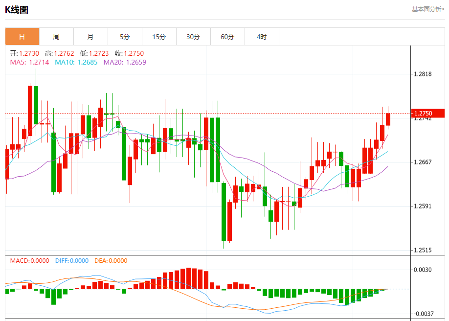 周四盘中,英镑/美元报1.2750,涨幅0.15%。