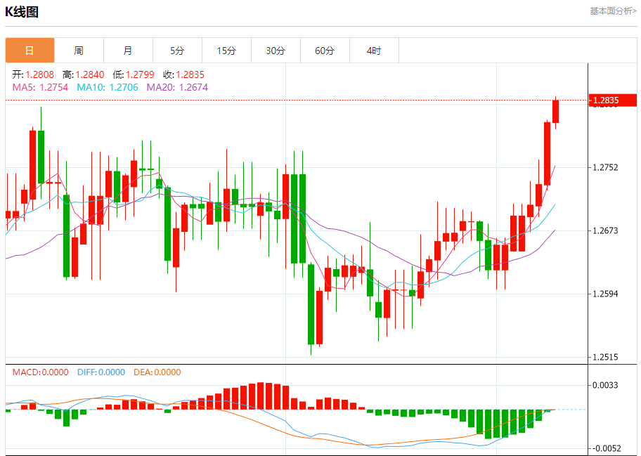 周五盘中,英镑/美元报1.2836,涨幅0.21%。