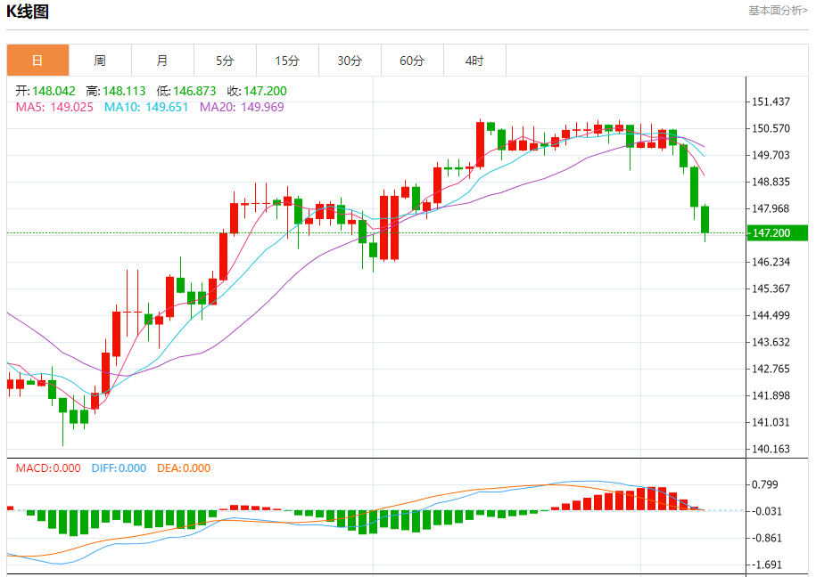 技术点评:跌破147.70,为空头信号,向下的目标将会是146.50。