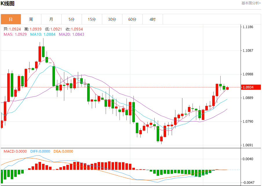 周二盘中,欧元/美元报1.0935,涨幅0.08%。