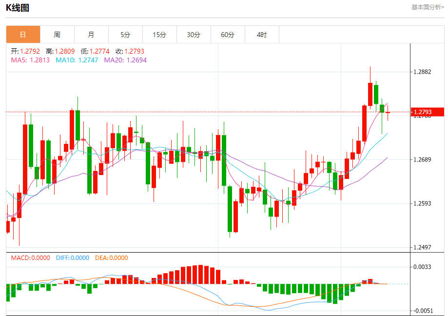 周三盘中,英镑/美元报1.2796,涨幅0.02%。