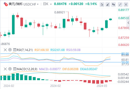 3月15日,周五欧市盘前,美元/瑞郎连续第三天上涨,上涨至0.8850附近。美国生产者价格指数强劲,提振美元/瑞郎走强。