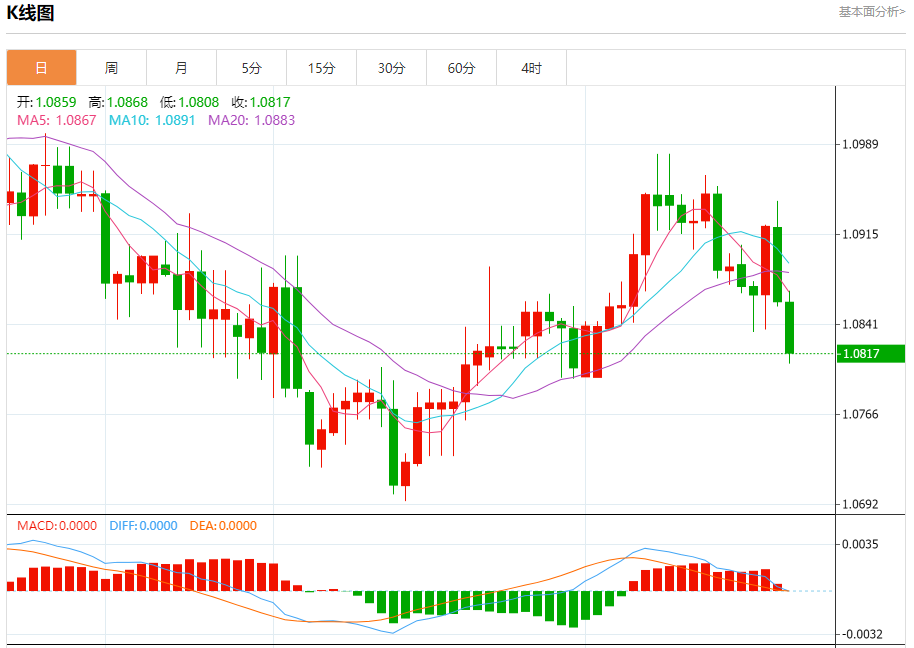 周五盘中,欧元/美元报1.0817,跌幅0.40%。