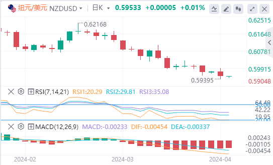 4月2日,周二亚市盘中,纽元/美元窄幅震荡,并将近期跌幅巩固至前一天触及的11月14日以来的最低水平。目前稳定在0.5950左右,似乎很容易延续持续数周的下降趋势。