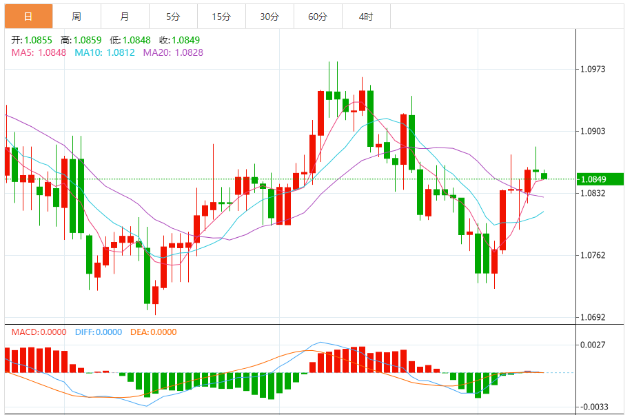 周三,欧元/美元徘徊于1.0850关口下方,现交投于1.0849附近,跌幅0.06%。