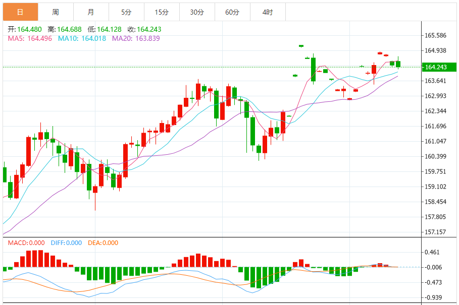 周四,欧元/日元下跌0.17%至164.255附近。