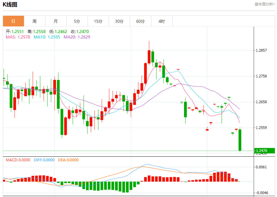 周五盘中,英镑/美元报1.2472,跌幅0.65%。