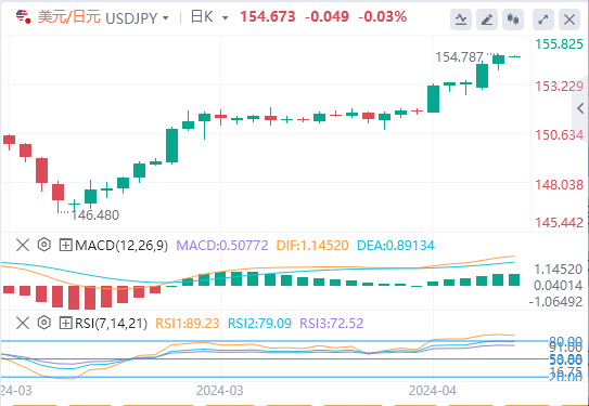 4月17日,周三亚市早盘,美元/日元略现下跌,处在154.65附近。美国经济强劲且通胀数据持稳,引发了美联储(Fed)可能将宽松周期从6月份推迟到9月份的预期,这为美元/日元提供了一些支撑。然而,中东紧张局势加剧可能会提振日元等避险资产,并限制美元/日元上行空间。