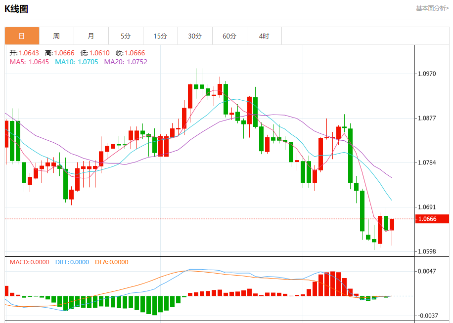 周五盘中,欧元/美元报1.0668,涨幅0.23%。