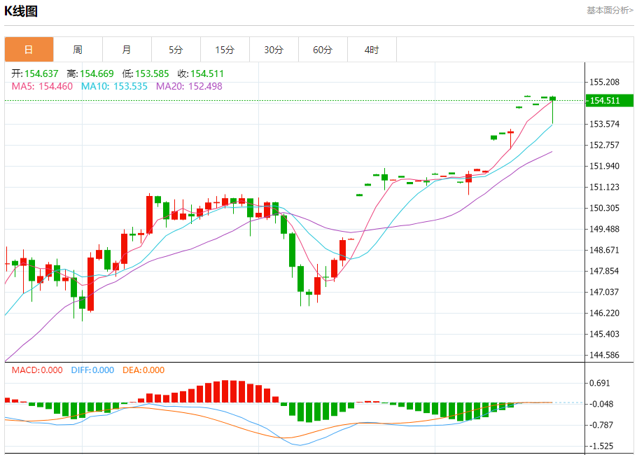 周五盘中,美元/日元报154.523,跌幅0.08%。