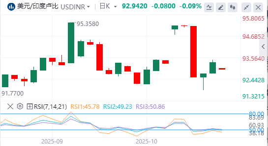 美元/印度卢比本周初开盘走低,跌至88.00附近。50附近的88.13日指数移动平均线(EMA)是美元/印度卢比多头的主要障碍。