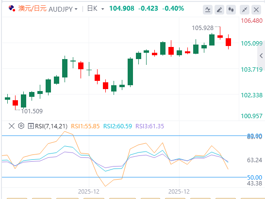 从日线图的技术分析角度来看,澳元兑日元(AUD/JPY)汇率稳稳守在上升的100周期指数移动平均线(100 - EMA)100.79以及20期均线104.35之上,整体保持着多头倾向。这两条均线均呈现出上行的坡度,为汇率的继续上涨提供了有力支撑。而且,在汇率回调过程中,这些均线附近往往会吸引买方入场,从而限制汇率的下跌空间。